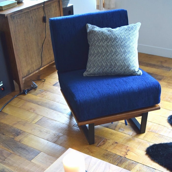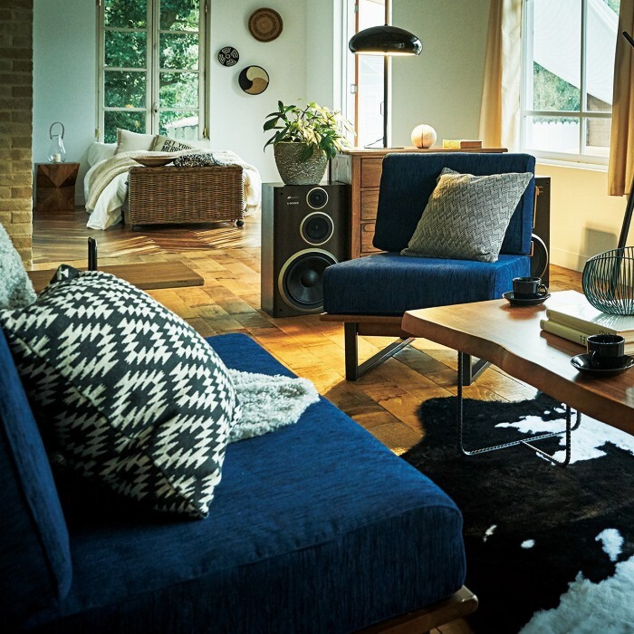 落ち着きのある綺麗なブルー色がお部屋の中で差し色となりインテリアの主役にもなるソファです。