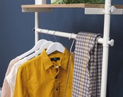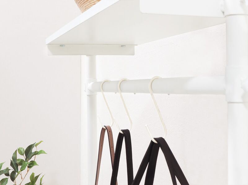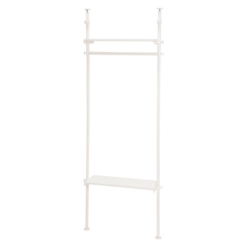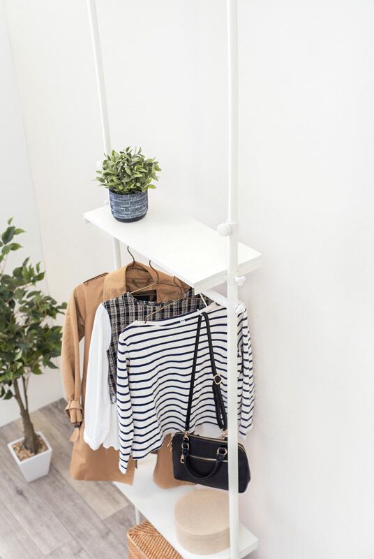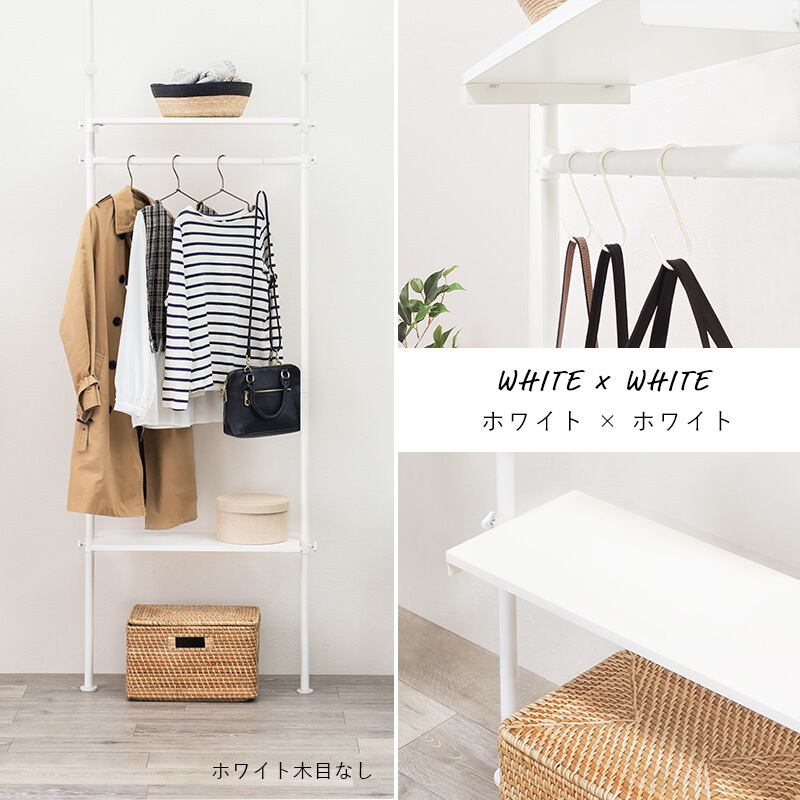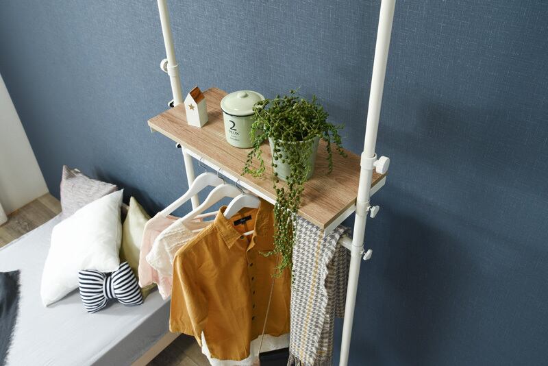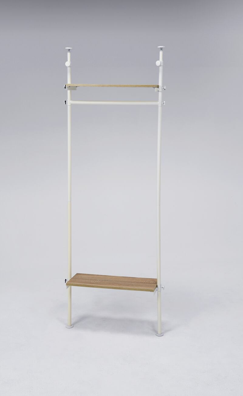 棚板とハンガーバーは無段階に高さ調節可能。スッキリ収納できるつっぱりハンガーラック。