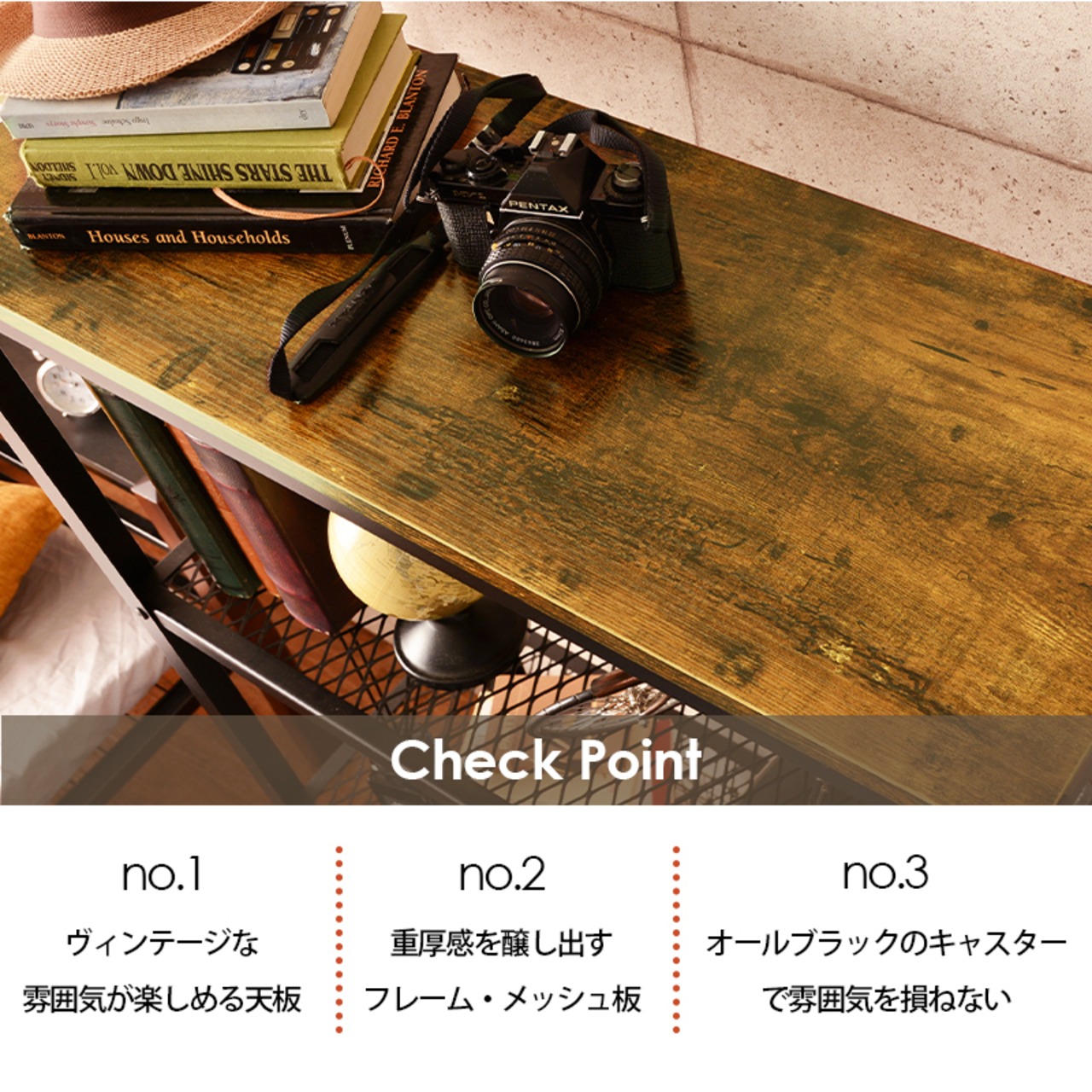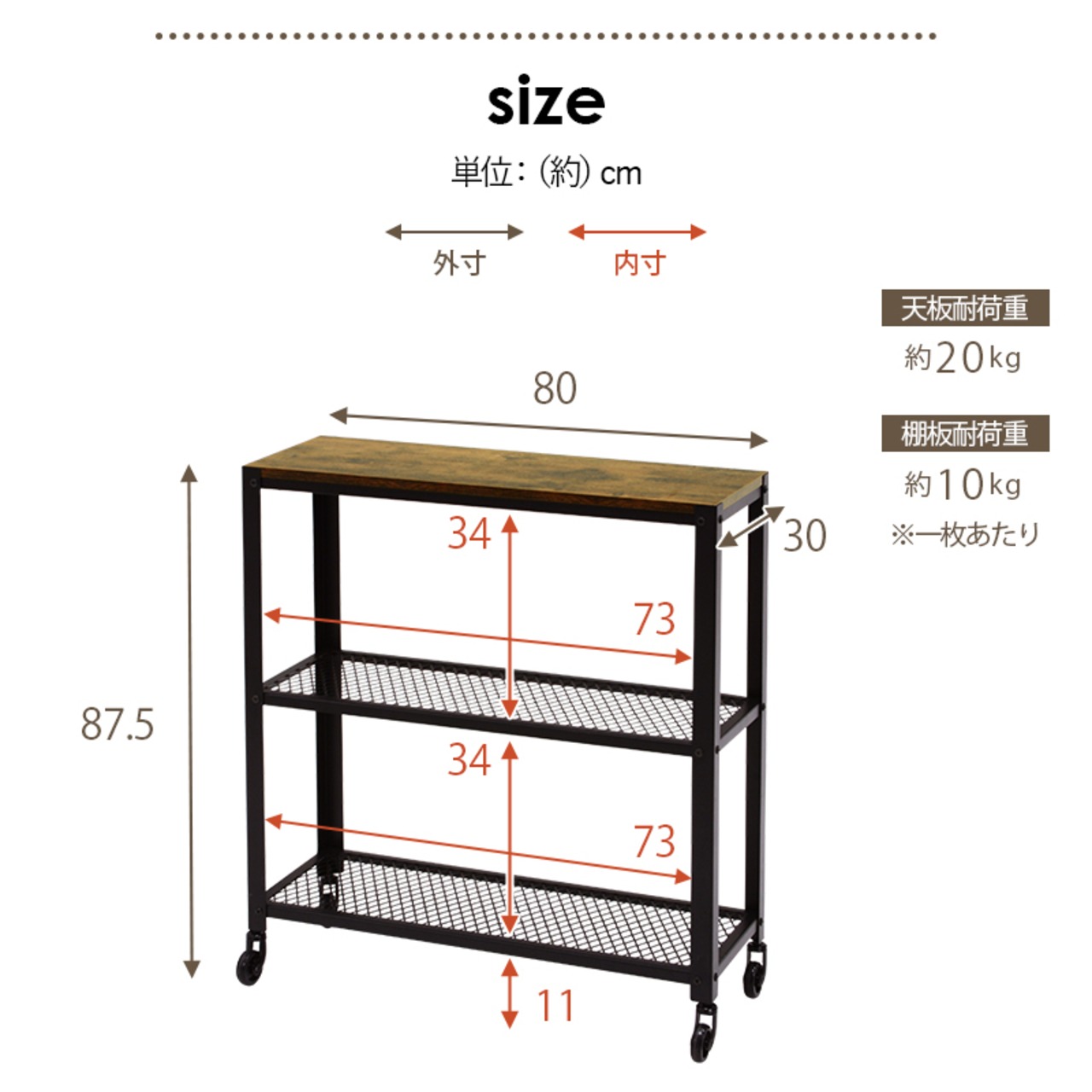 ■組立式■キャスター付■天板:約幅80×奥行30cm■固定棚:約幅80×奥行30cm■棚間隔:約34cm