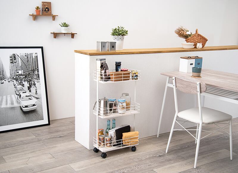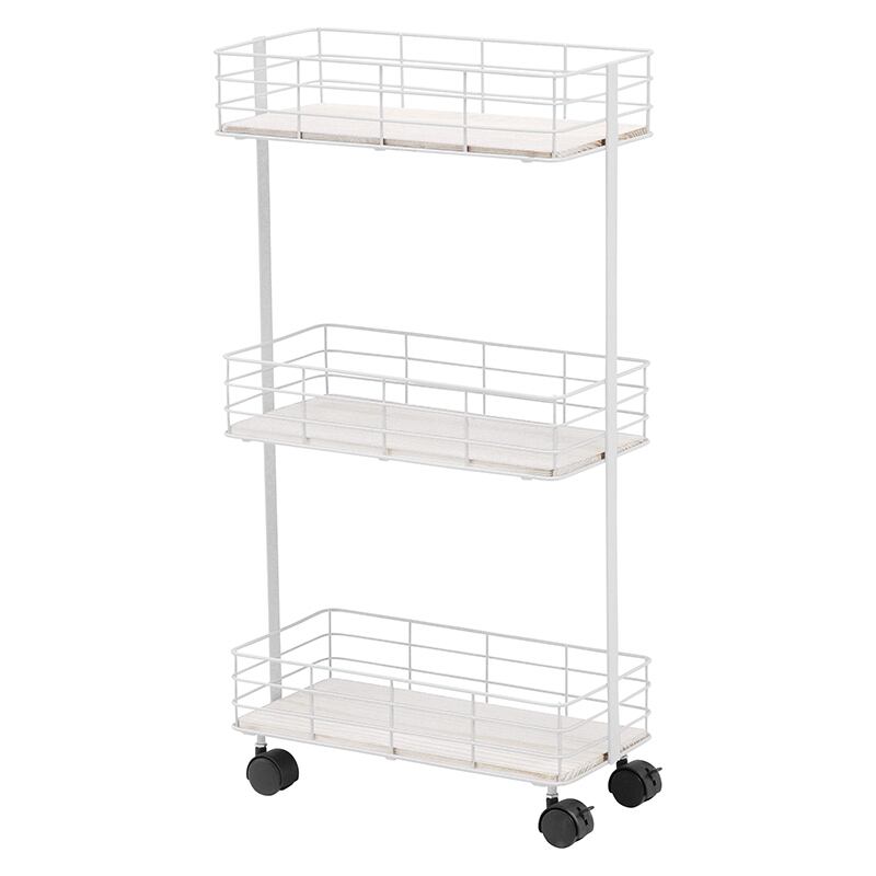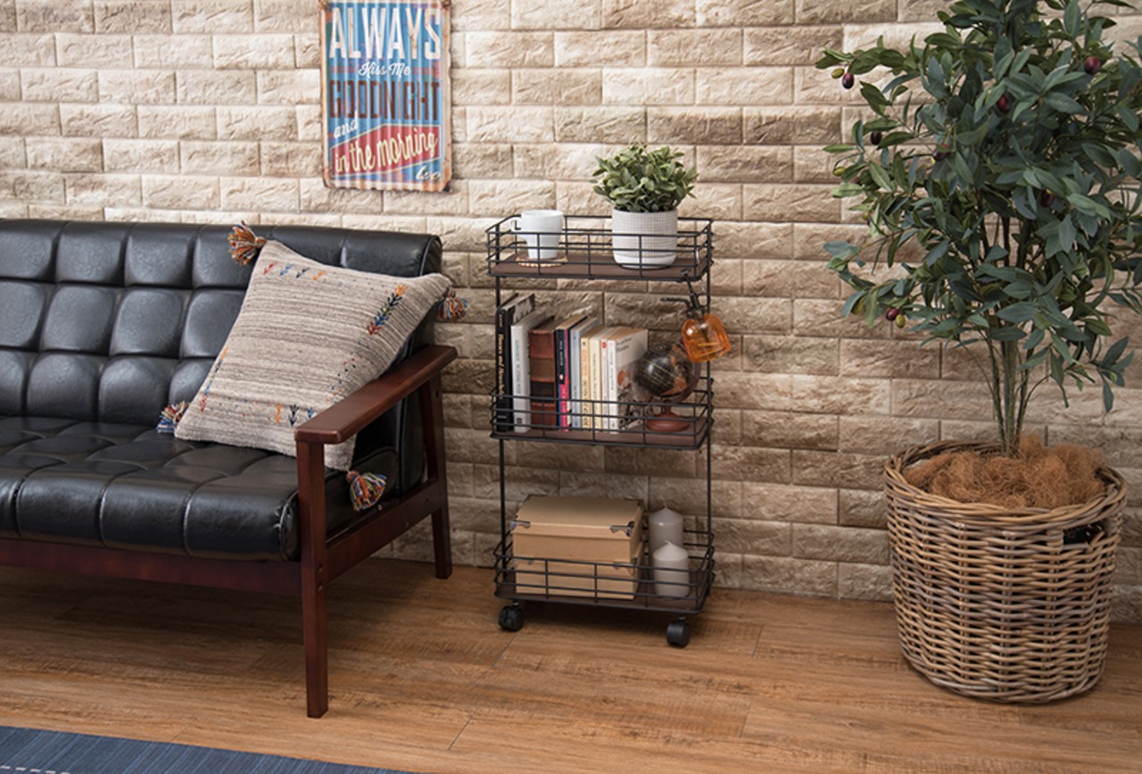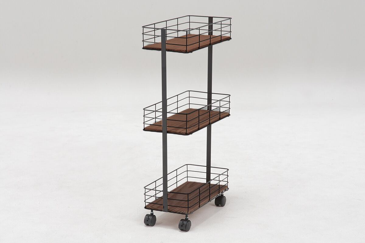 木材と細めのアイアンを組み合わせたキャスター付きラック。