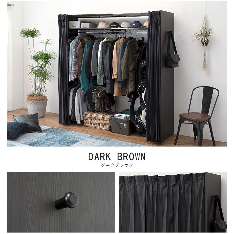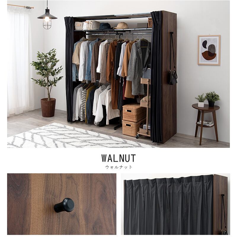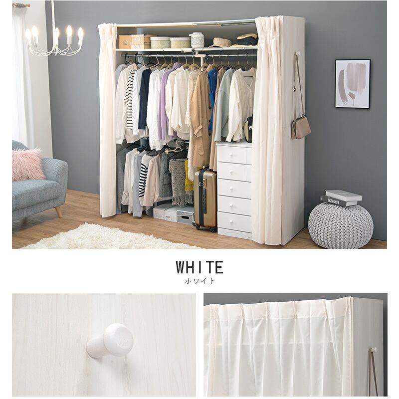 スペースに合わせて伸縮可能なクローゼットハンガー。上棚、カーテン付き。