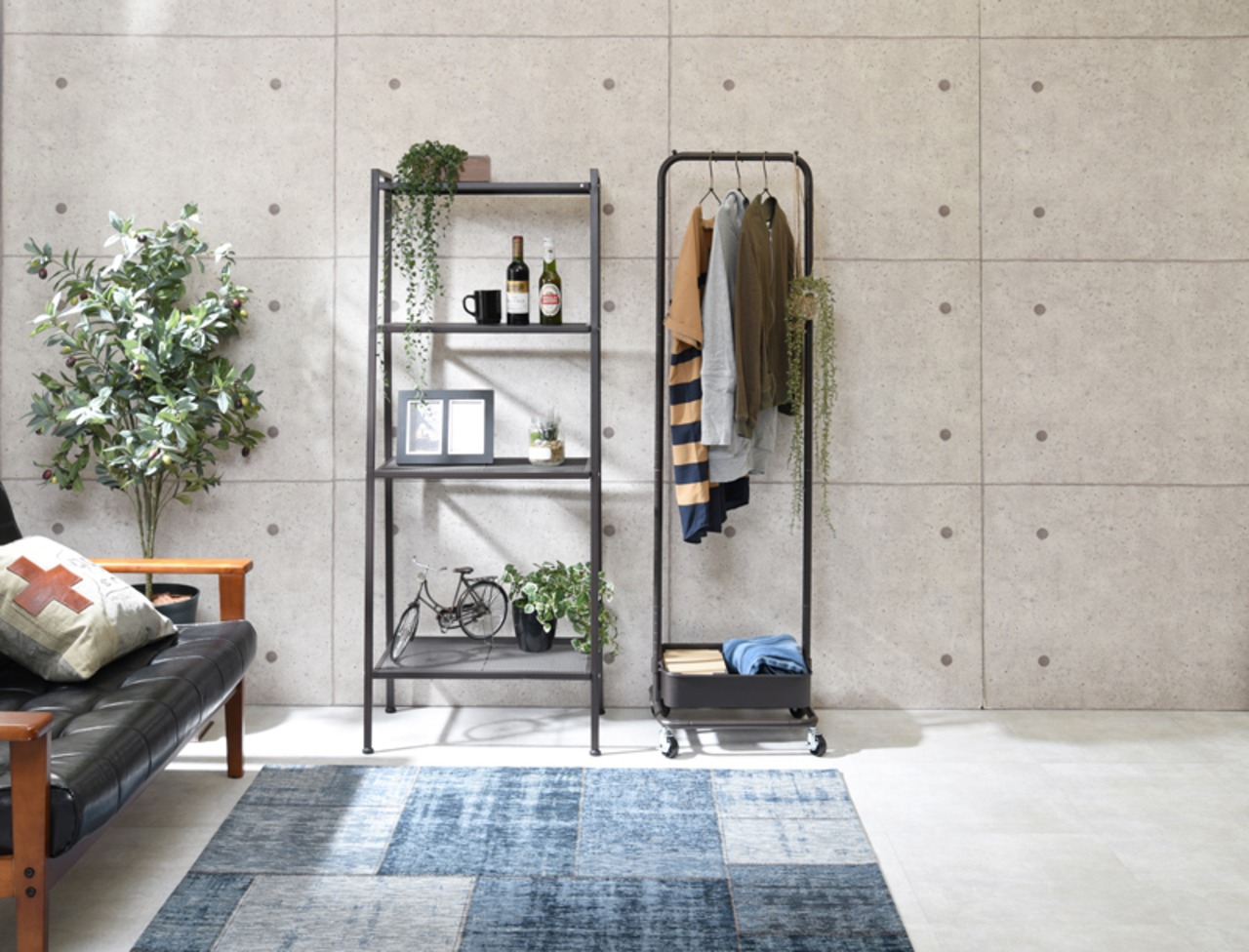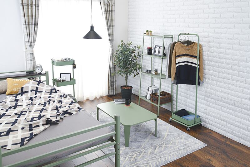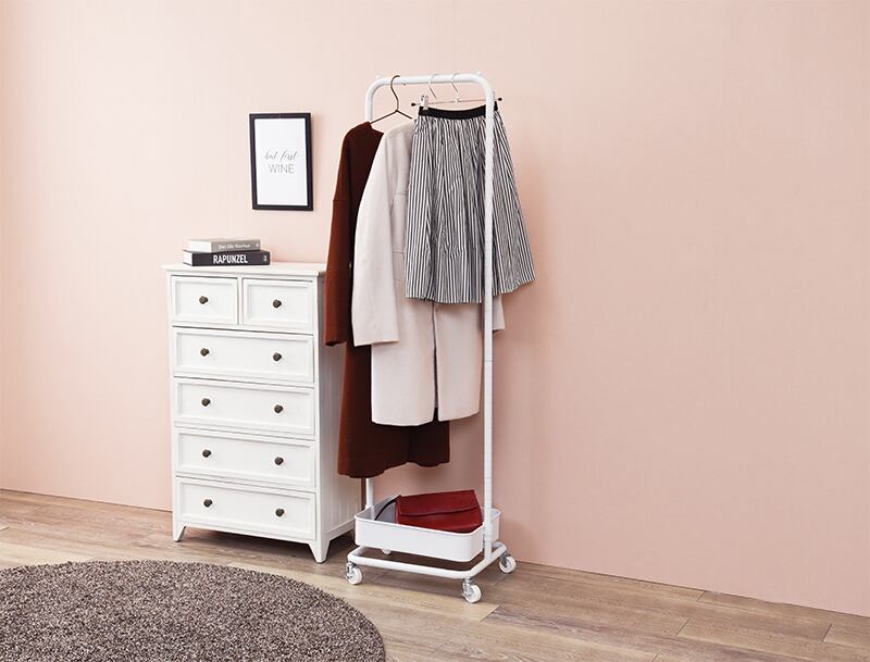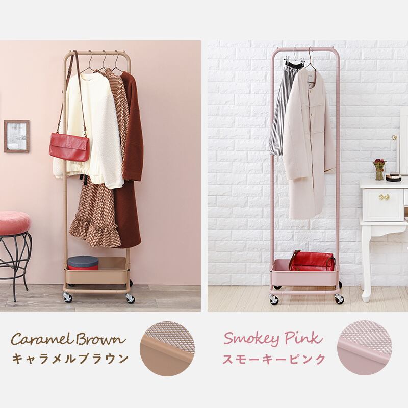 高さが変えられる。バスケット付きハンガーラック