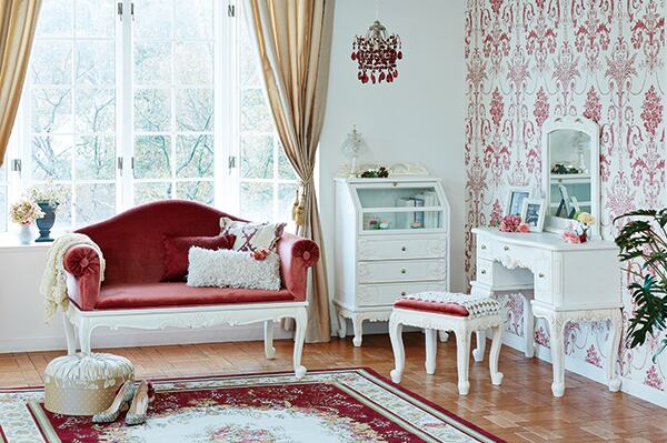 エレガントな彫刻とねこ脚、引き出しの上はガラス張りで見せる収納ができるアンティーク風ガラスキャビネット