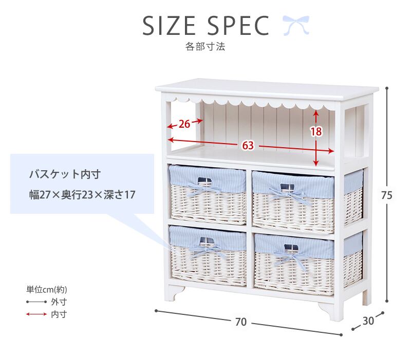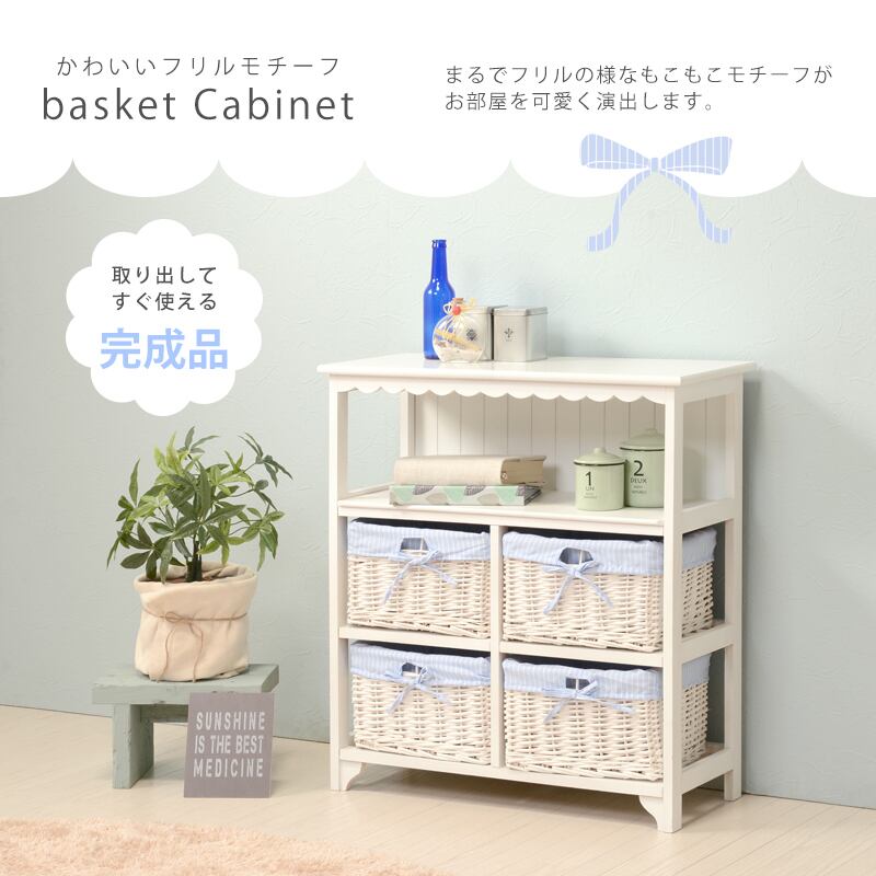 まるでフリルが付いたようなデザインが可愛いデザインのキャビネット。内布付きバスケット4つ付き