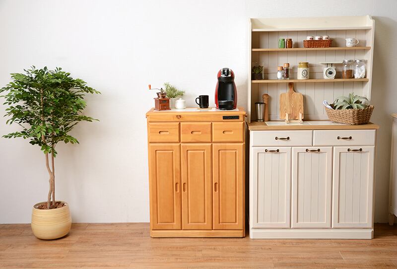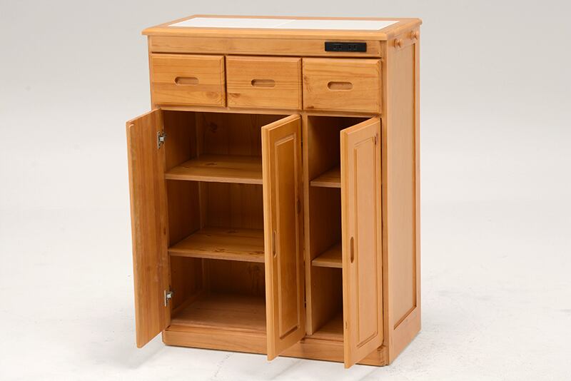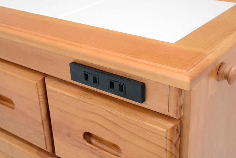 便利な前面コンセント付。天然木パイン材の温もりあふれるキッチンカウンター。シンク横でも使いやすい高さ91cmのハイタイプ。