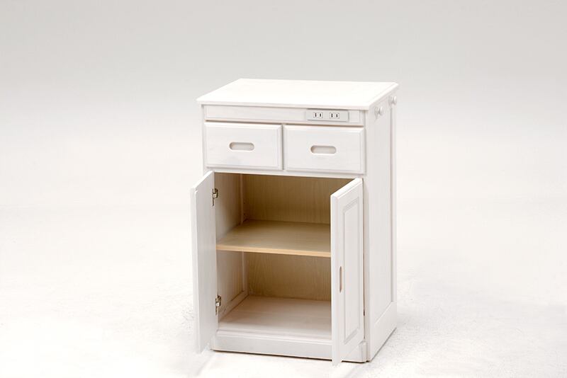 便利な前面コンセント付。天然木パイン材の温もりあふれるキッチンカウンター。ダイニングの高さに合う高さ71cm。