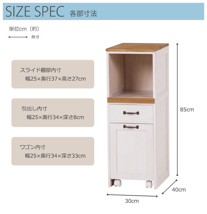 ■ 引出内寸:(約)幅25×奥行34×深さ8cm ■ ワゴン内寸:(約)幅25×奥行34×深さ33cm ■ オープン部内寸:(約)幅25×奥行37×高さ27cm ■ スライド棚付き ■ 1口コンセント付き