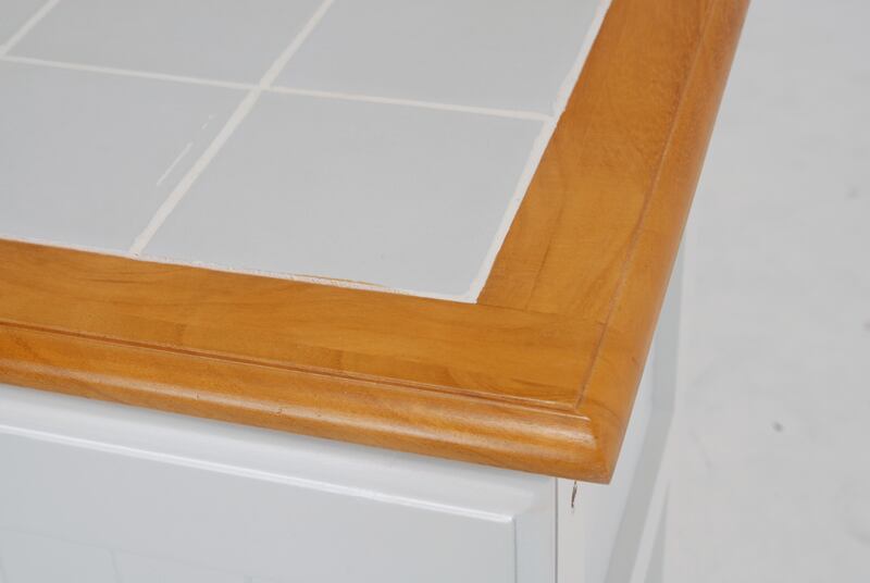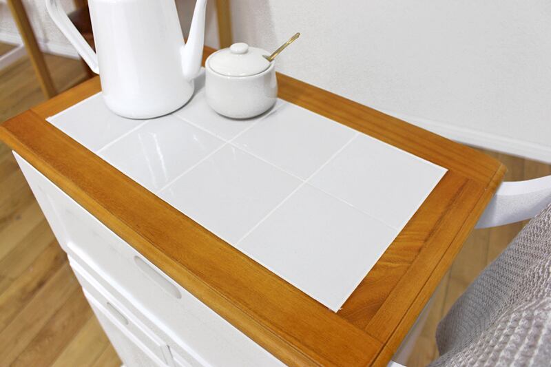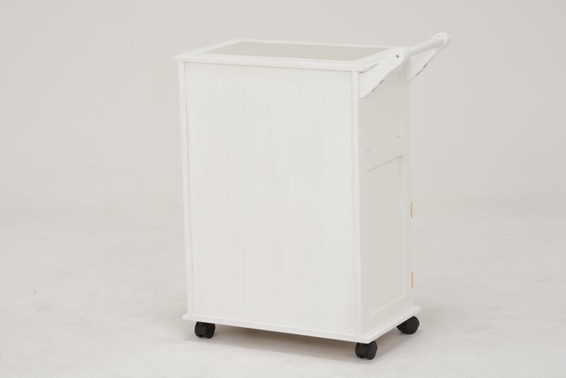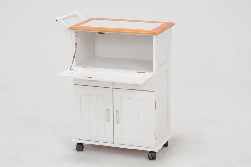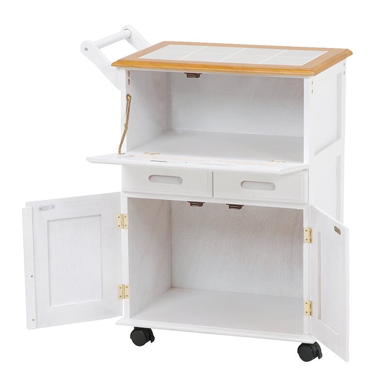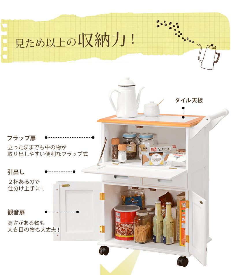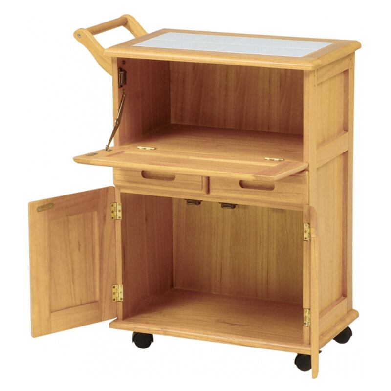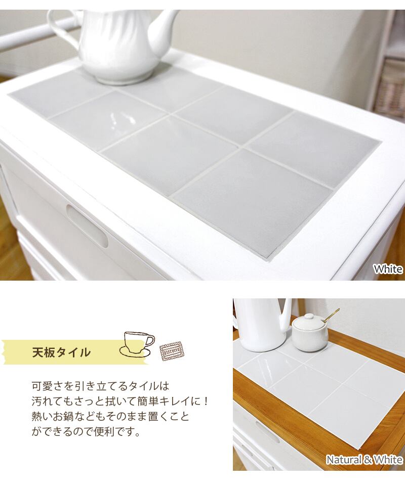 キャスター付きで移動も楽々なシンプルなキッチンワゴン。天板はタイル張りなので熱い鍋、やかんなどを直接置くことが可能です。