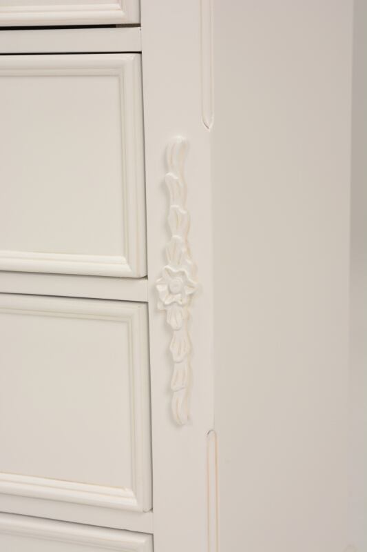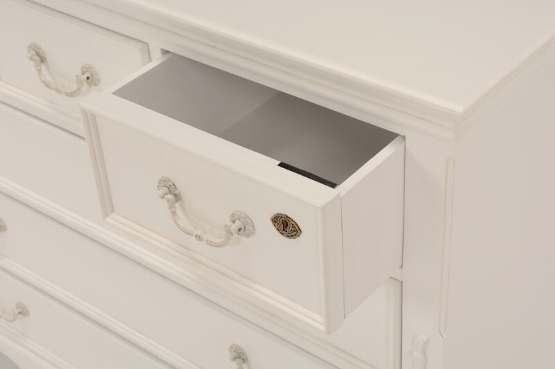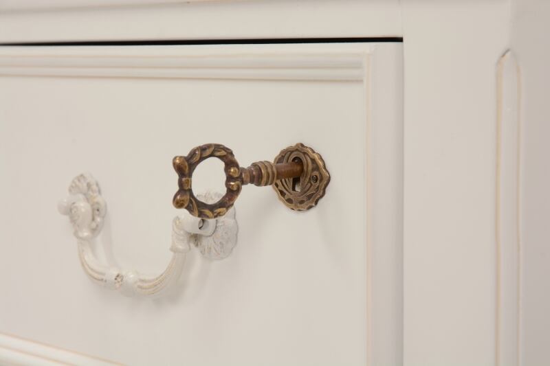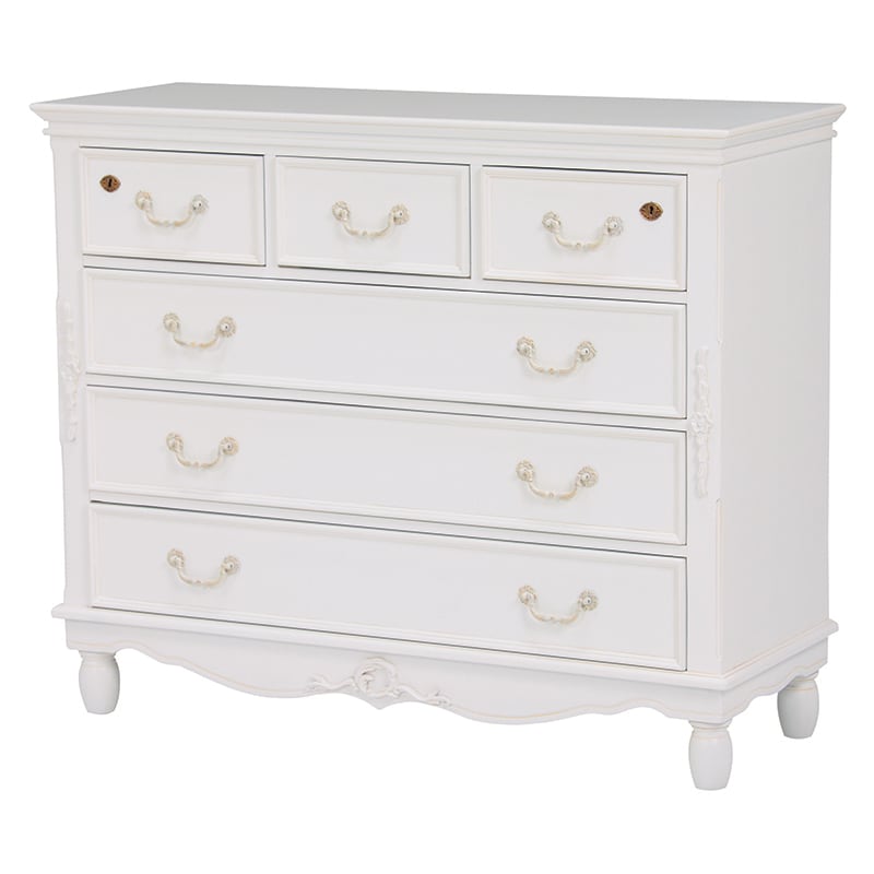 エレガントな彫刻が施された引出しつきアンティーク風ワイドチェスト。引き出し2個は鍵付き。
