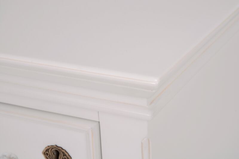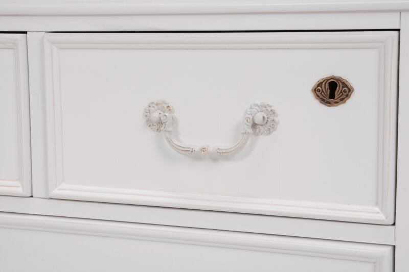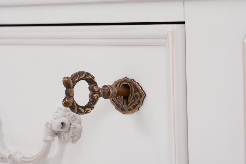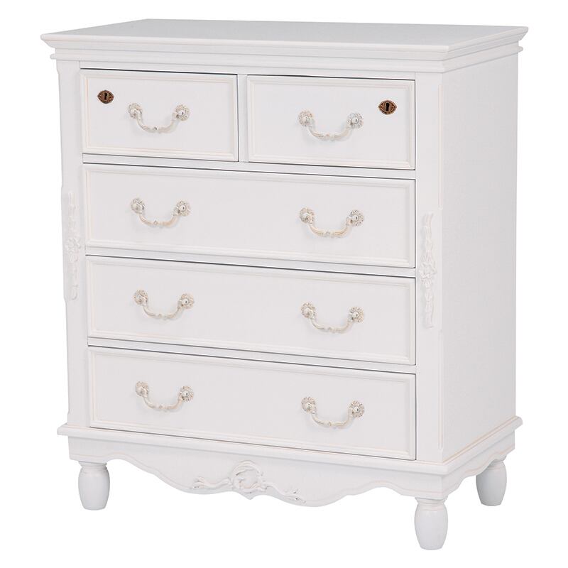 エレガントな彫刻が施された引出しつきアンティーク風チェスト。引き出し2個は鍵付き。